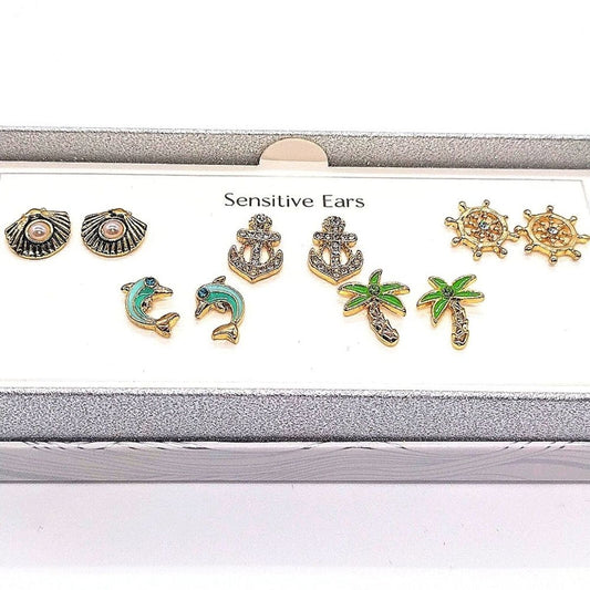 Bay Studio Gold 5 Stud Earrings Set Dolphin Clam Anchor Palm Tree Cubic Zirconia