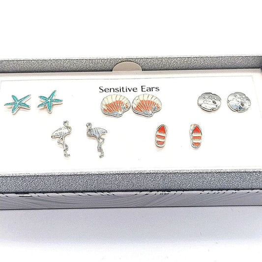 Bay Studio Silver 5 Stud Earrings Set StarFish Flamingo Clam Sand Dollar Sandals