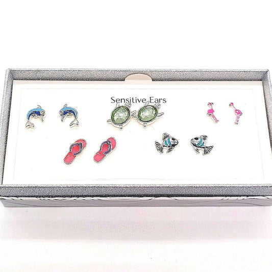 Bay Studio Silver 5 Stud Earrings Set Dolphin Turtle Sandals Fish Flamingo